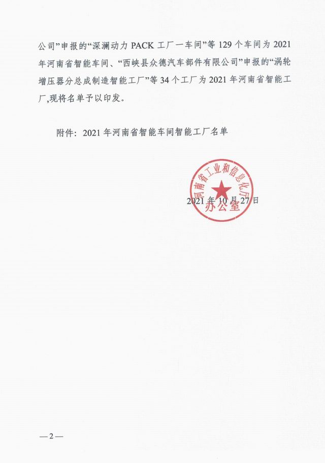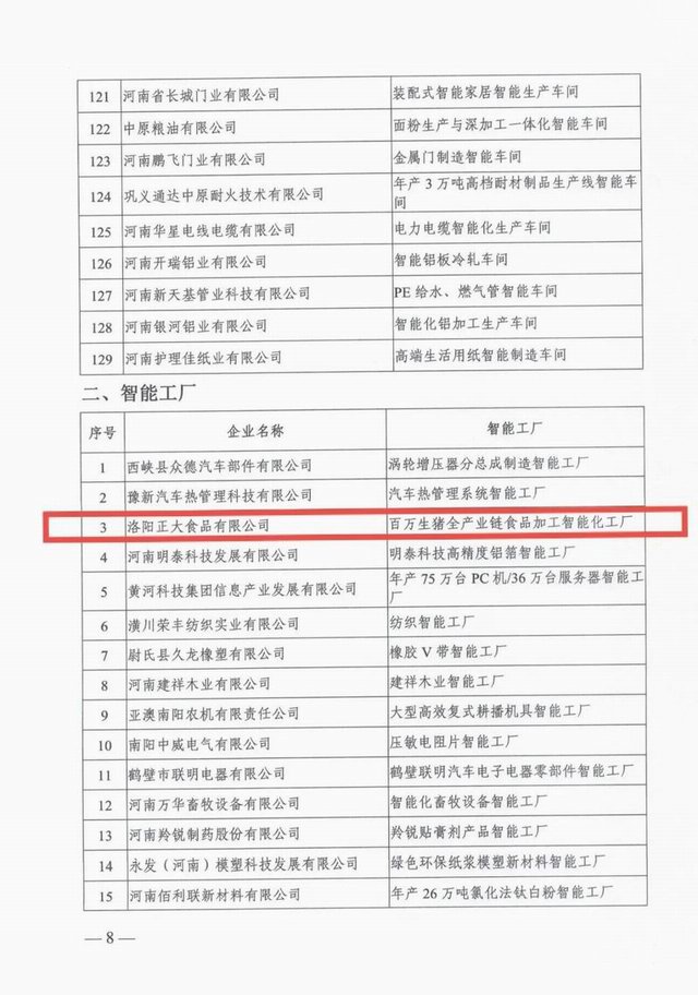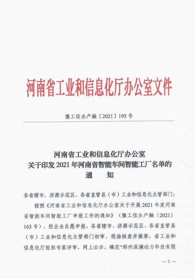按照《河南省工業(yè)和信息化廳辦公室關于開展2021年度河南省智能車間智能工廠申報工作的通知》(豫工信辦產(chǎn)融〔2021〕163號),經(jīng)企業(yè)志愿申報、各地工業(yè)和信息化主管部門初審和現(xiàn)場核查、省工業(yè)和信息化廳組織專家評審、網(wǎng)上公示,河南省工業(yè)和信息化廳確定129個智能車間為2021年河南省智能車間、34個智能工廠為2021年河南省智能工廠。2021年10月27日,河南省工業(yè)和信息化廳辦公室下發(fā)文件《河南省工業(yè)和信息化廳辦公室關于印發(fā)2021年河南省智能車間智能工廠名單的通知》(豫工信辦產(chǎn)融【2021】195號)予以公布。洛陽正大獲評2021年河南省智能工廠!