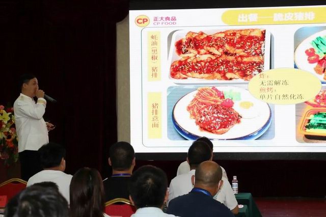 注冊中國烹飪大師、洛陽正大食品研發(fā)廚務(wù)總監(jiān)張立新先生向團(tuán)餐大會介紹了洛陽正大食品開發(fā)的十余款預(yù)制豬肉調(diào)理產(chǎn)品,并從后廚實(shí)操角度分享了產(chǎn)品特色和賣點(diǎn),逐一介紹了出餐加工標(biāo)準(zhǔn)和配餐流程。