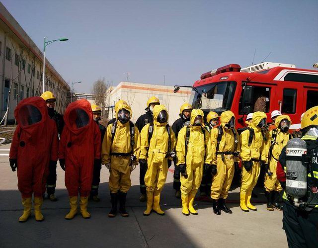洛陽(yáng)市消防支隊(duì)王榮范參謀長(zhǎng)、西工區(qū)消防大隊(duì)劉學(xué)康大隊(duì)長(zhǎng)及洛陽(yáng)正大總裁辦喬光斌總經(jīng)理、食品事業(yè)部杜光輝副總經(jīng)理一行在演練前到達(dá)演練場(chǎng)地進(jìn)行安排部署,成立了消防演練現(xiàn)場(chǎng)指揮部,由洛陽(yáng)市消防支隊(duì)王榮范參謀長(zhǎng)任指揮長(zhǎng)。演練假設(shè)正大食品有限公司制冷機(jī)房因設(shè)備發(fā)生故障,液氨罐發(fā)生泄漏,1名操作人員受困,現(xiàn)場(chǎng)人員立即向公司領(lǐng)導(dǎo)匯報(bào)并撥打119尋求支援。119指揮中心在接到報(bào)警后,由洛陽(yáng)市消防支隊(duì)協(xié)調(diào),迅速調(diào)集澗西消防大隊(duì)下屬谷水中隊(duì),西工區(qū)消防大隊(duì)下屬車站中隊(duì)、紅山中隊(duì)迅速趕赴現(xiàn)場(chǎng),與此同時(shí)正大食品有限公司迅速啟動(dòng)單位應(yīng)急預(yù)案,組織員工疏散。十五分鐘后,紅山消防中隊(duì)6臺(tái)消防車、2臺(tái)救護(hù)車到達(dá)現(xiàn)場(chǎng),消防戰(zhàn)士著防化服立即進(jìn)入現(xiàn)場(chǎng),對(duì)氨中毒人員進(jìn)行搶救,對(duì)氨泄漏部位進(jìn)行應(yīng)急處置。二十分鐘后谷水中隊(duì)、車站中隊(duì)6臺(tái)消防車達(dá)到現(xiàn)場(chǎng)支援, 50余名消防員展開(kāi)救援戰(zhàn)斗,用消防水槍噴水中和泄漏的氨氣,降低空氣中氨的濃度。經(jīng)過(guò)近一個(gè)小時(shí)的搶維修,氨泄漏得到控制,演練指揮中心宣布本次演練***結(jié)束。